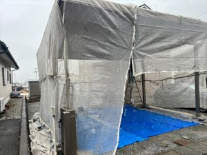 まずは全体に養生をして、剥がしたペフが周囲に飛散しないよう、また後に塗装をするときに周囲に塗料が飛び散らないよう、養生をします。