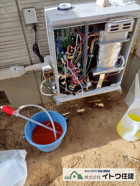 交換工事ではまず循環液を排出しますが、ここで“劣化具合”を確認することが非常に重要です。