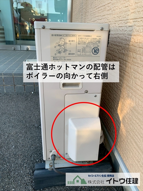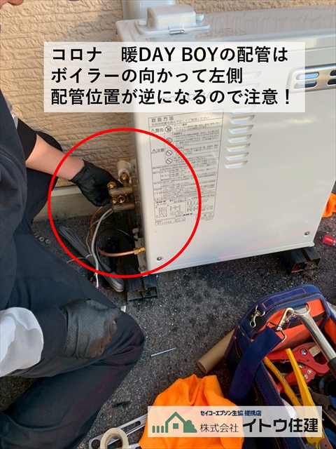 富士通ホットマンは配管が本体向かって右側にありますが、コロナ暖DAY BOYは反対側に配置されています。