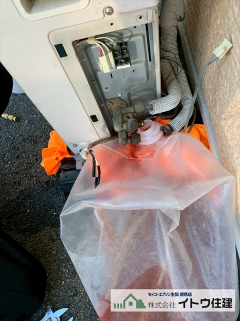 長年使われた温水ルームヒーター内部には、循環液が残っています。