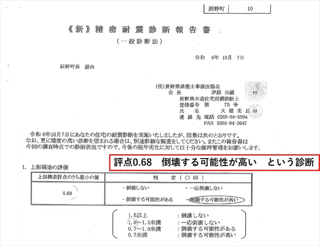 辰野町の耐震診断を受けた結果、耐震評点は0.68。