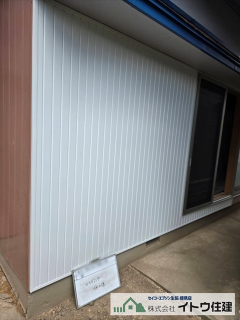 一旦張った白い金属サイディングの上から、既存外壁の色味に合わせて塗装を行いました。