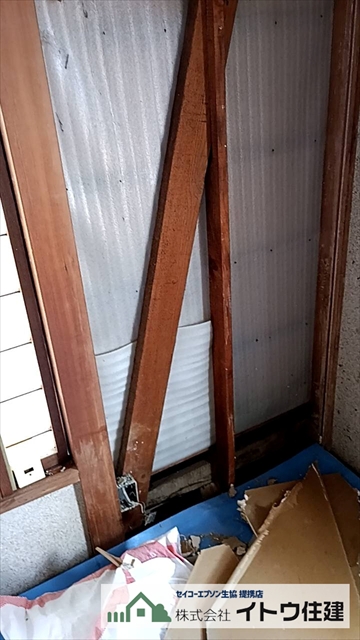 既存の壁材や下地を丁寧に解体し、構造材の状態を確認しながら次の工程へ進みます。