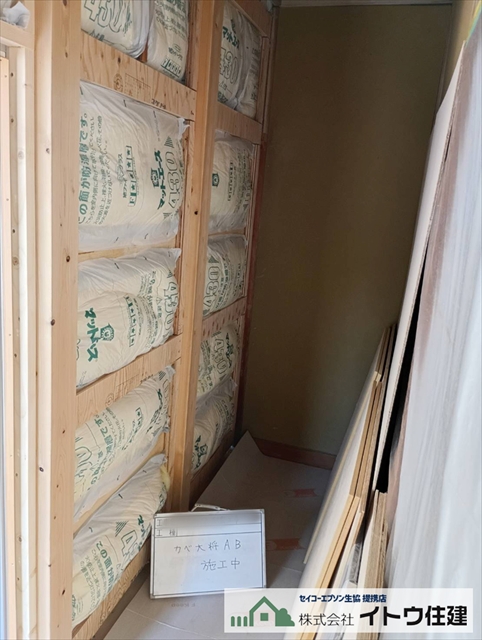 2階和室の耐震壁にも、1階と同様にグラスウール断熱材を入れました。