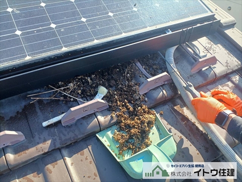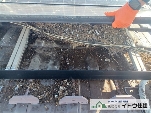 築20年の瓦屋根には、太陽光パネルが後付けで設置されており、フレームの隙間からハトが侵入して巣を作っていました。