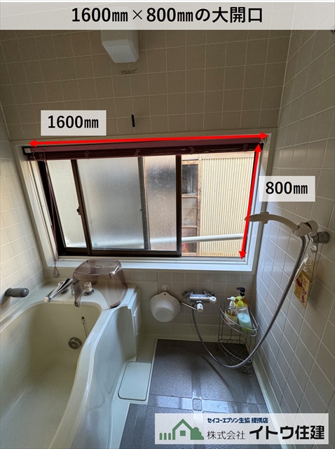 既存の浴室には1600㎜×800㎜の大開口窓がありました。