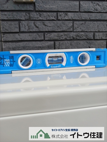撤去後は新しい基礎位置を水平確認して、次の設置準備へ進みます。